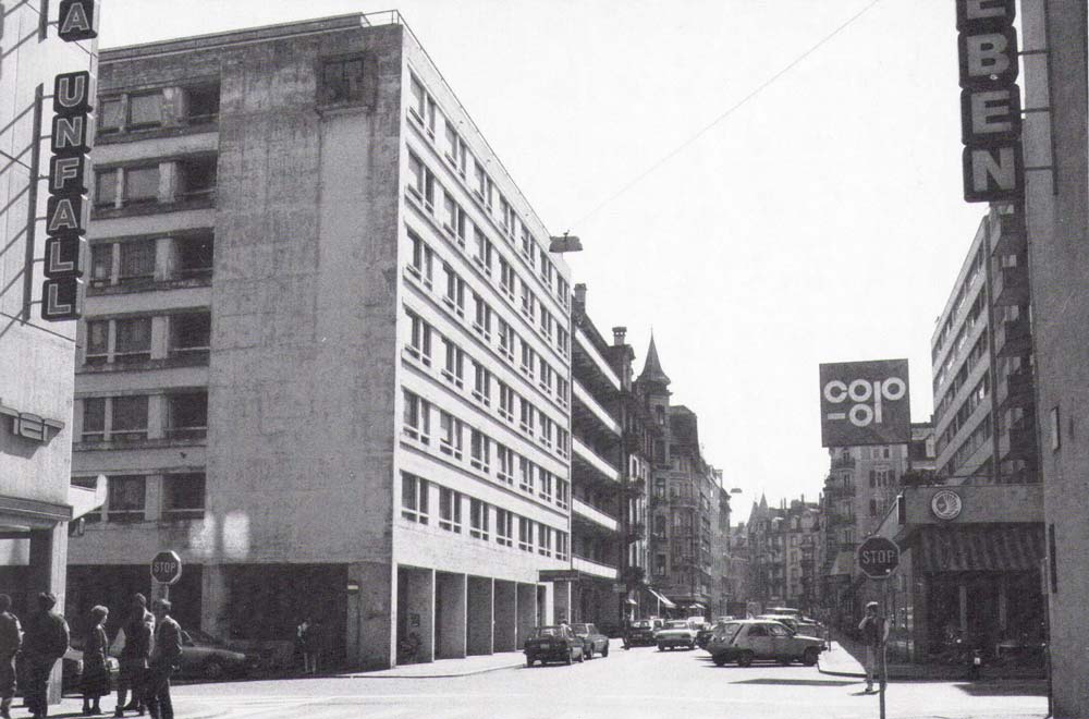 Der Arleccino Bau von 1960 mit stark verwitterter Nordwestfassade in den Achtzigerjahren.