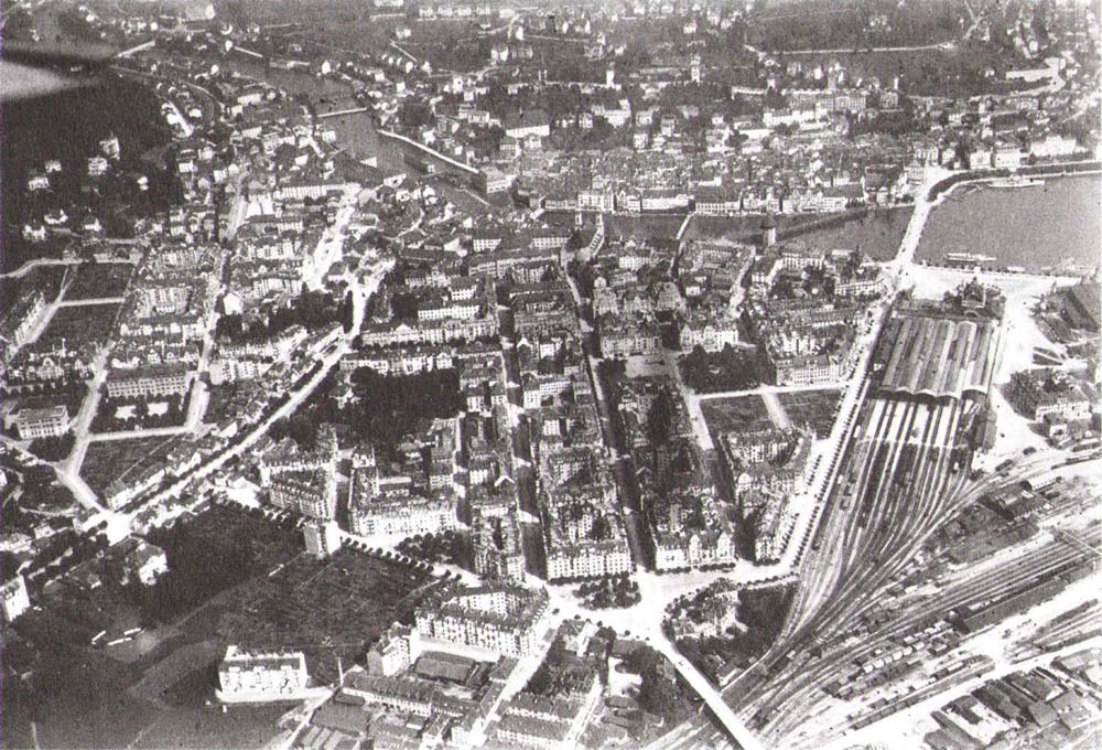 1918: Deutlich erkennbar ist die grüne Lunge des Hirschmattquartiers, das von dichtem Baumbestand umgebene Vögeligärtli. Die Zentralmatte bis zu den Bahngleisen und das Areal der nachmaligen Zentralbibliothek sind noch unbebaut. Der grosszügige Bundesplatz entspricht in seiner Anordnung mit Inselpark und Verkehrsführung den heutigen Verhältnissen. Rechts neben dem Bahnhof ist die für das Schützenfest von 1901 errichtete Festhalle zu sehen. (Staatsarchiv Luzern)