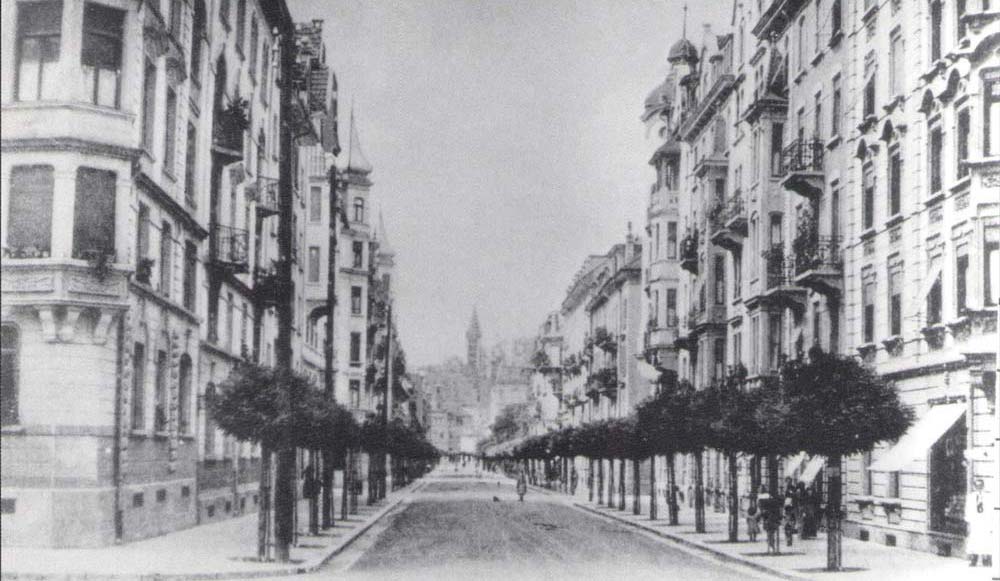 Blick vom Bundesplatz auf die (noch nicht geteerte) Hirschmattstrasse in einer Ansicht von 1910: Der grosszügig angelegte Boulevard wird nicht mehr von Linden, sondern von Kugelakazien gesäumt.