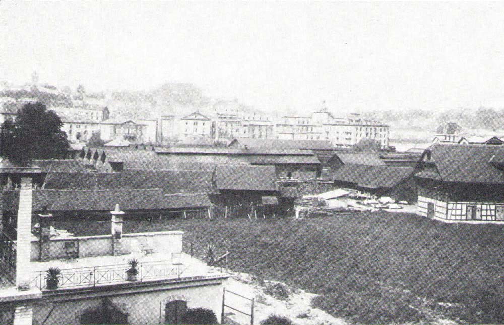 Luzern als Barackenstadt: Blick vom Inselihof (Hirschmattstrasse 29, Restaurant Basilico) über den Anbau der Wirtschaft zum Biregghof gegen die Gasfabrik und das Bahnhofareal. Das Bild wurde 1896 aufgenommen und zeigt sowohl den alten Bahnhof als auch den neuen (zu erkennen an der Kuppel hinter den Merkur-Wohnbauten). Links neben dem Wasserturm ist die Villa Luise zu sehen, wo heute das Nationalbankgebäude mit der Sammlung Rosengart steht.