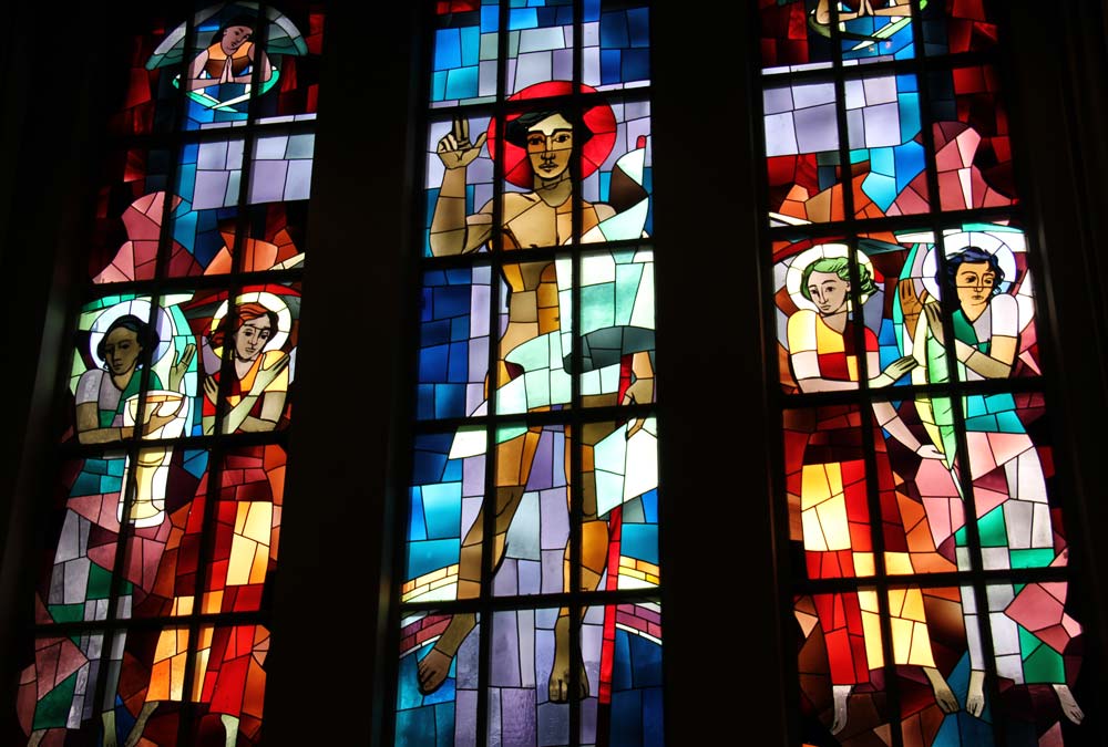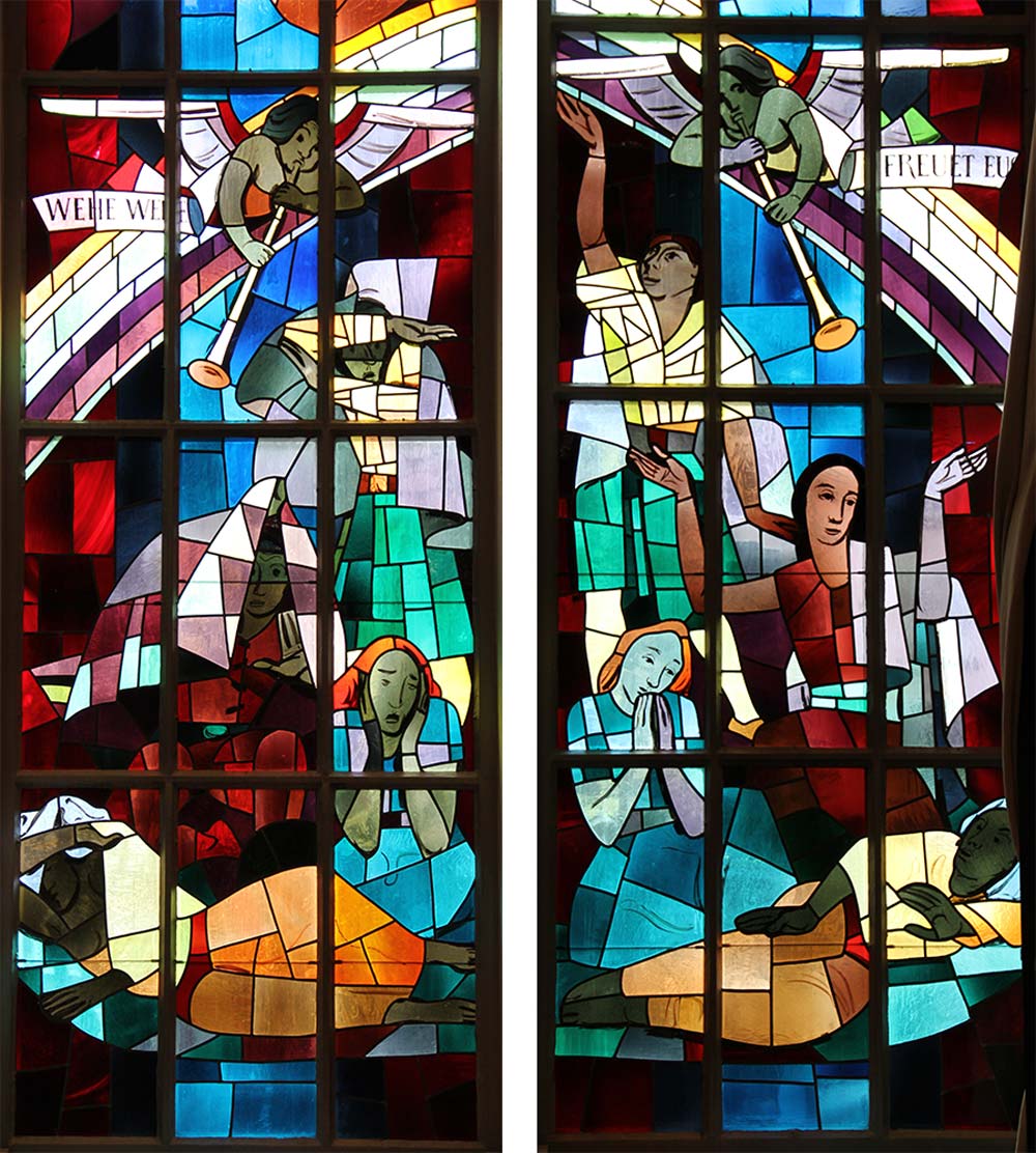 Das monumentale, dreiteilige Chorfenster von Louis Moilliet zeigt die Auferstehung. Moillet schuf in der Lukaskirche auch 14 Seitenfenster.