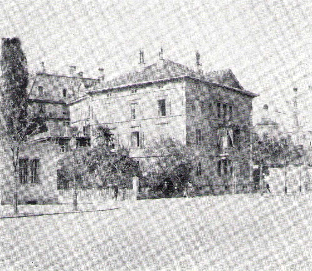 An der Stelle der Nationalbank stand bis 1922 die Villa Luise (rechts die Bahnhofkuppel und der Kamin der Wäscherei des Hotels Du Lac). Die Villa Luise gehörte dem Bankier Louis Falck.