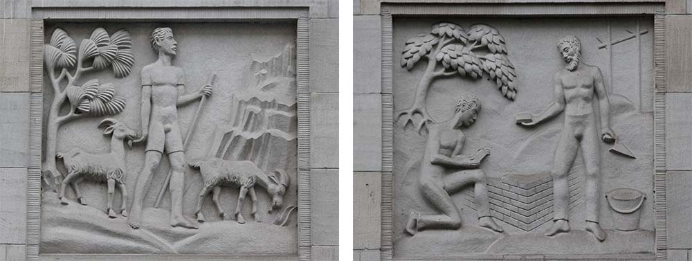 Hermann Herter beschränkte den künstlerischen Schmuck auf eine spärliche Ausgestaltung: Über dem Hauptportal prangt ein grösseres, in Sandstein gehauenes, von zwei Löwen gehaltenes Wappen, die Seitenwände sind mit dezenten Steinhauerarbeiten verziert, über den beiden Eingängen an der Seidenhofstrasse und an der Pilatusstrasse werden Darstellungen aus dem früheren Wirtschaftsleben gezeigt.