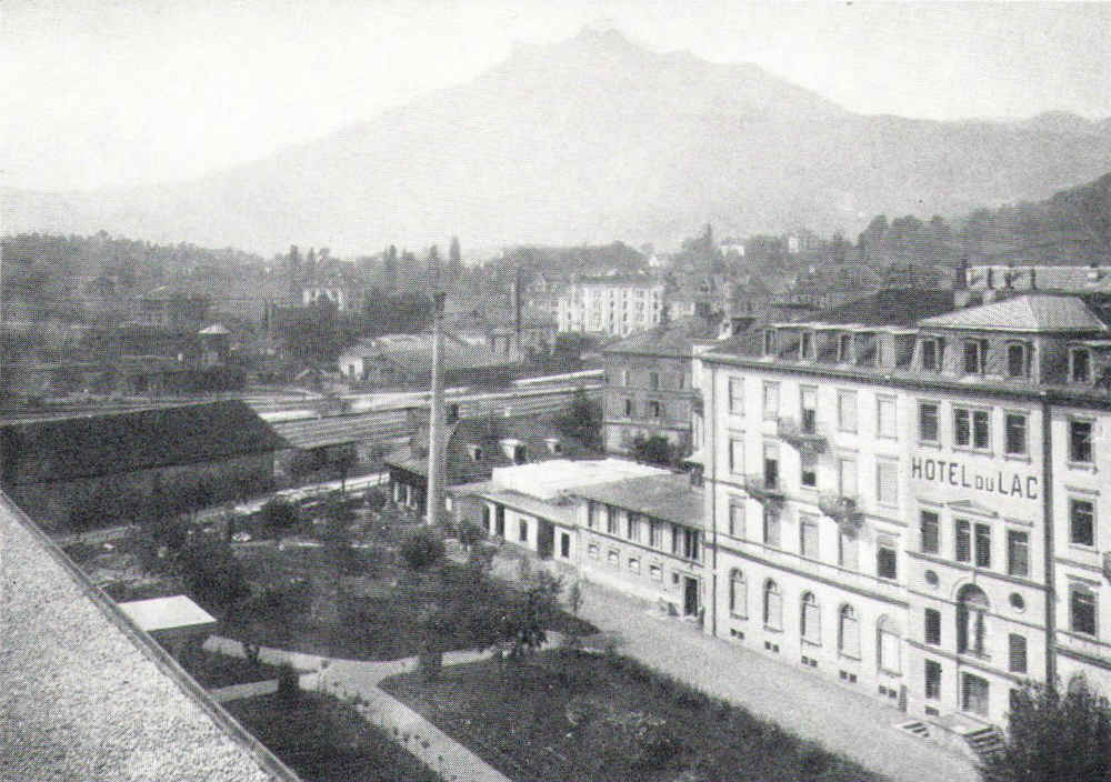 Blick vom Dach des Postgebäudes über das Areal des ehemaligen Seidenhofes (vor 1896). Rechts ragt der Westtrakt des Hotels Du Lac (an der Seidenhofstrasse) in das Bild hinein. Sehr gut sind der Hotelgarten und dahinter das Kesselhaus sowie die Hotelwäscherei zu erkennen (mit Kamin). Hinter den Gleisanlagen sind die alte Gasfabrik und der Kellerhof (in der Mitte des Bildes) zu sehen, hinter der Wäschehänge (auf dem Flachdach des Hotelanbaus) die Villa Luise an der Stelle der heutigen Sammlung Rosengart.